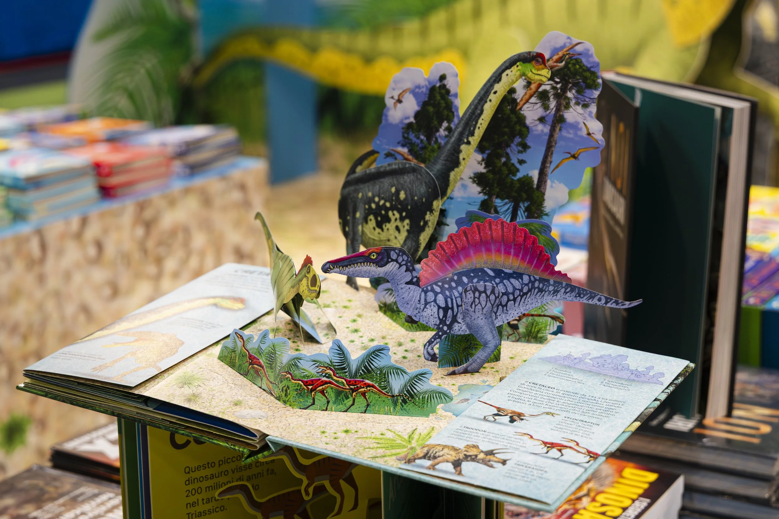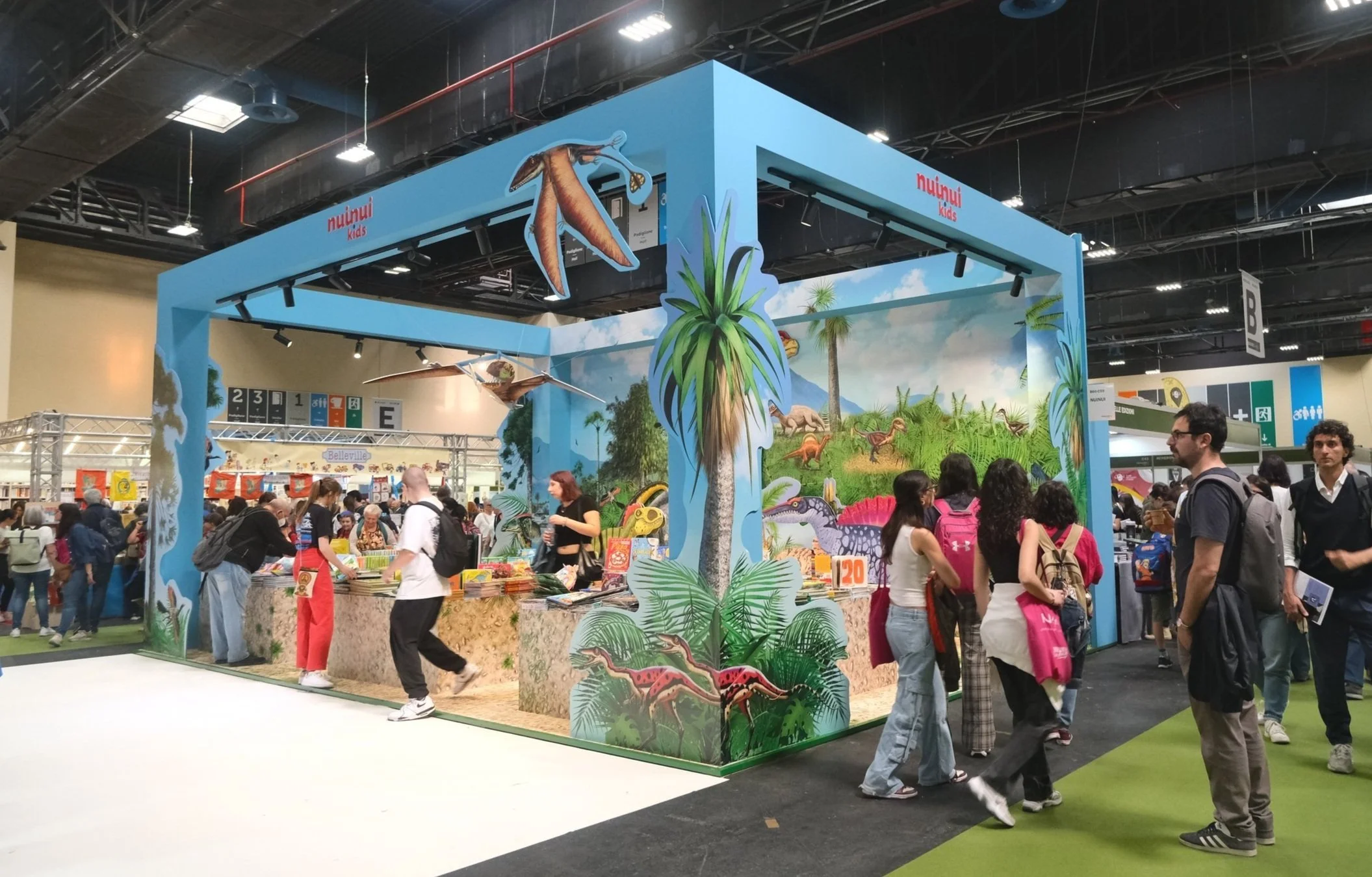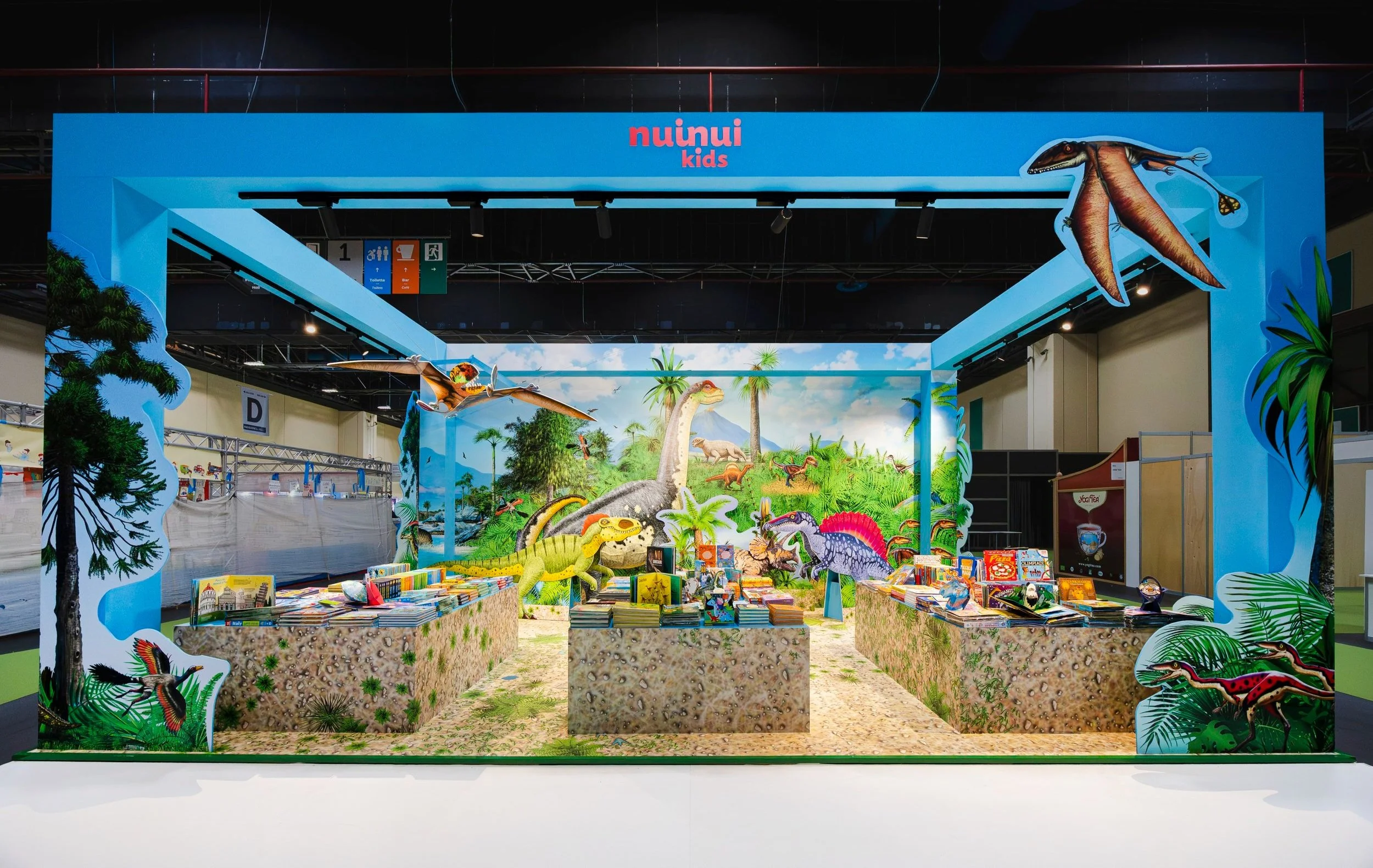 Salone del Libro Torino 2025, NUINUI’s stand designed for kids transforms into a giant open pop-up book, immersing visitors in the playful, prehistoric world of their dinosaur-themed children’s title.