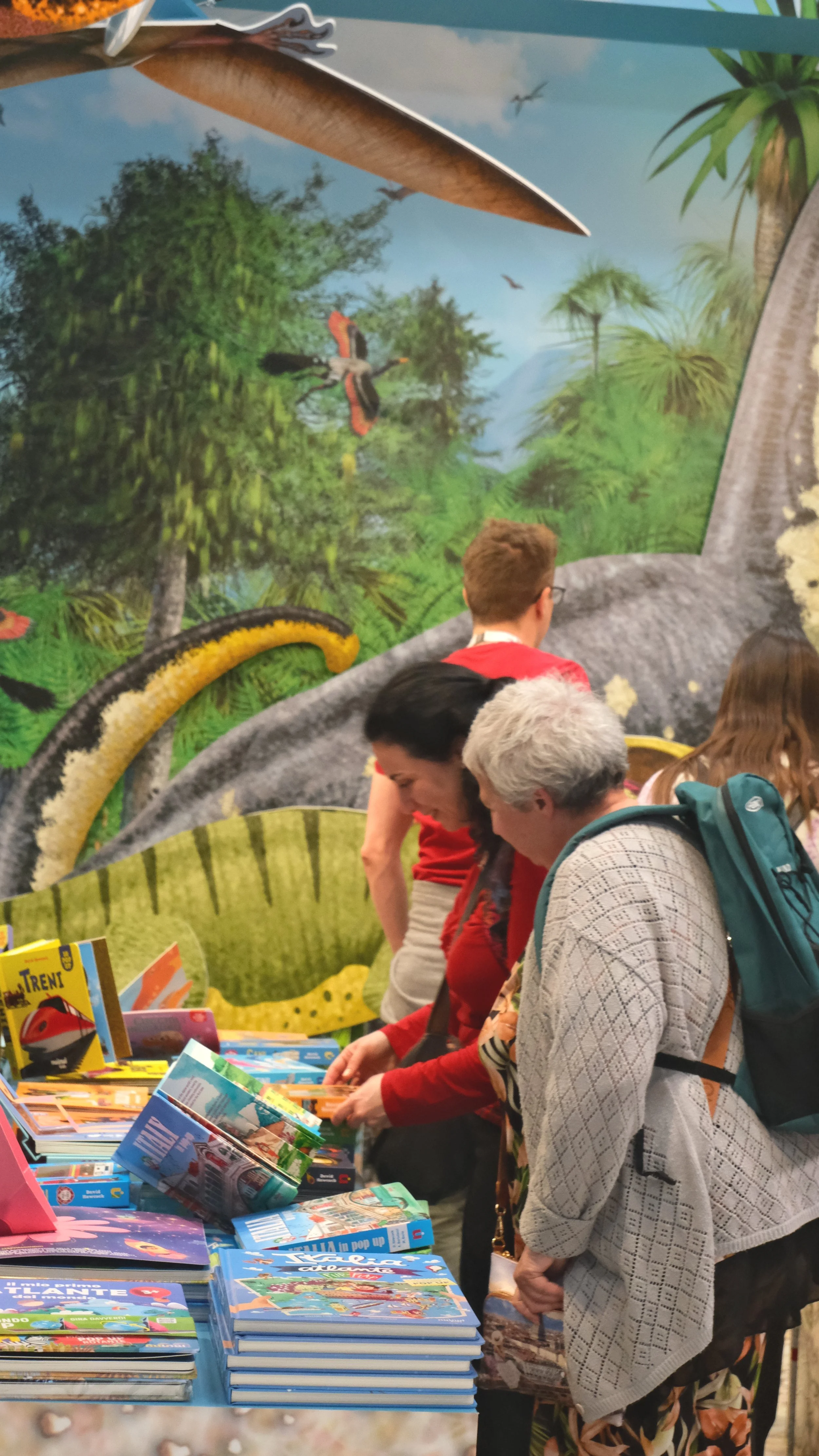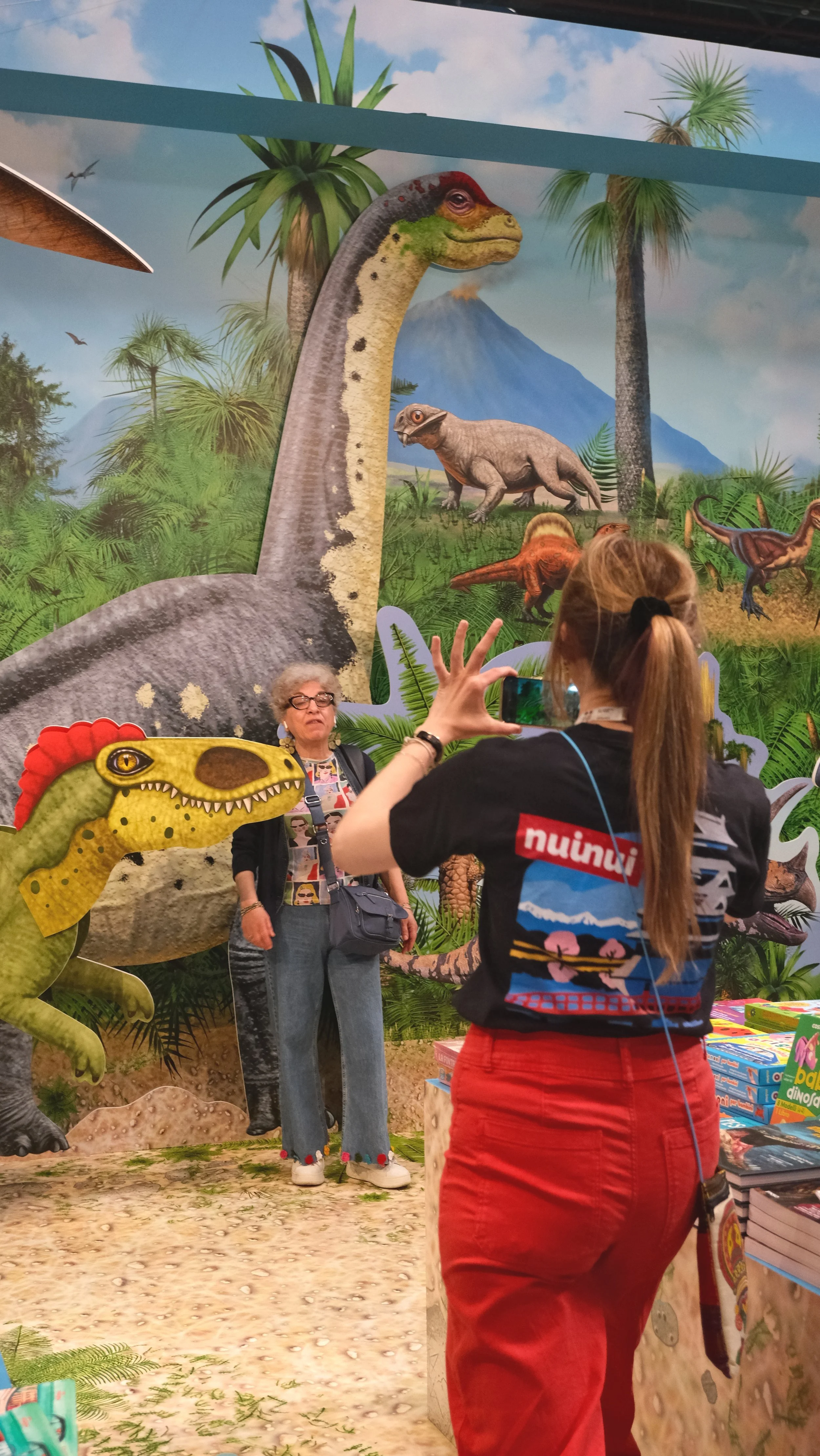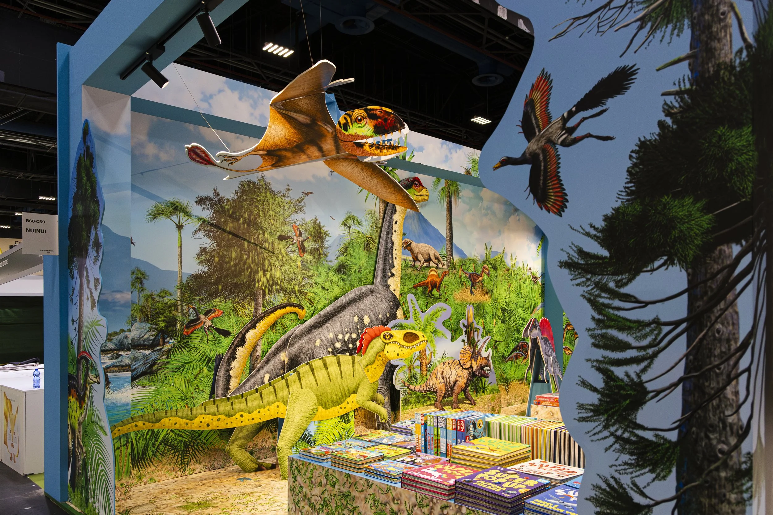 Salone del Libro Torino 2025, NUINUI’s stand designed for kids transforms into a giant open pop-up book, immersing visitors in the playful, prehistoric world of their dinosaur-themed children’s title.